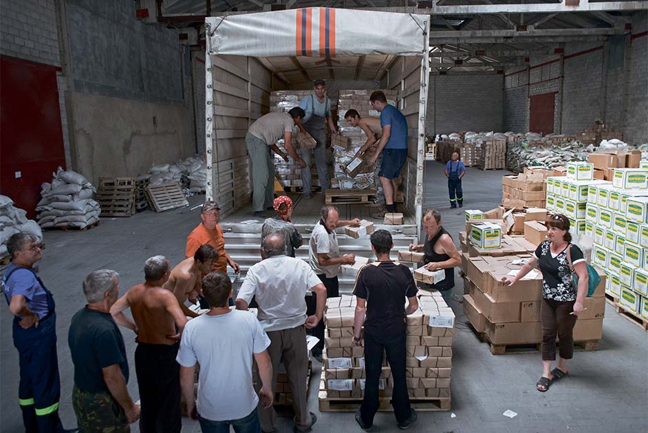 Волонтеры разгружают один из автомобилей 37-го гуманитарного конвоя МЧС России, прибывшего