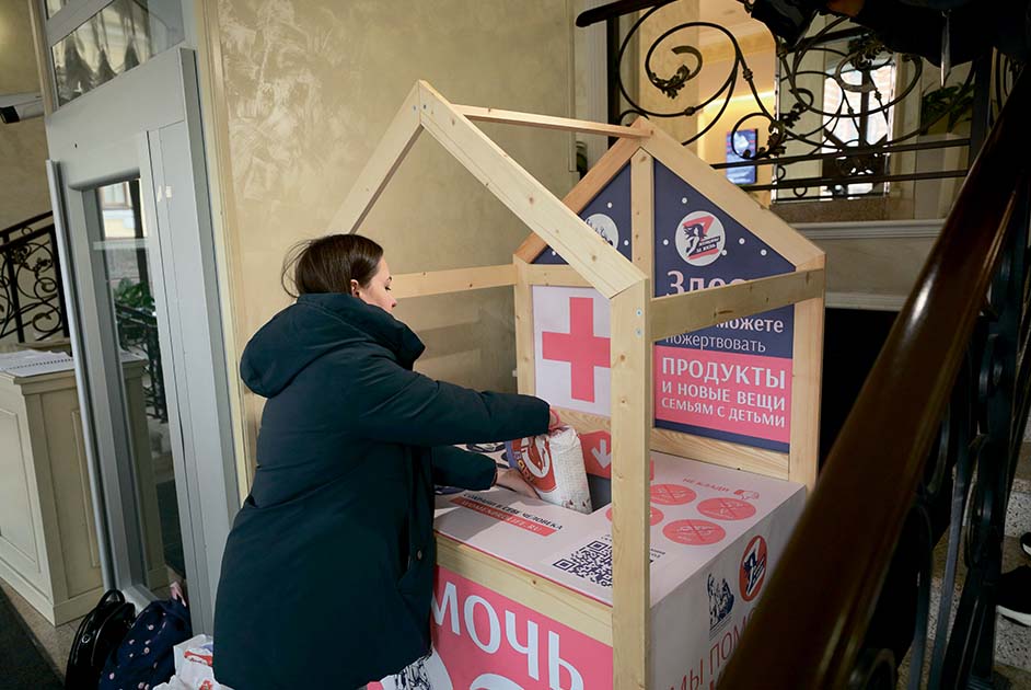 Место сбора гуманитарной помощи, организованное в здании Общественной палаты РФ /