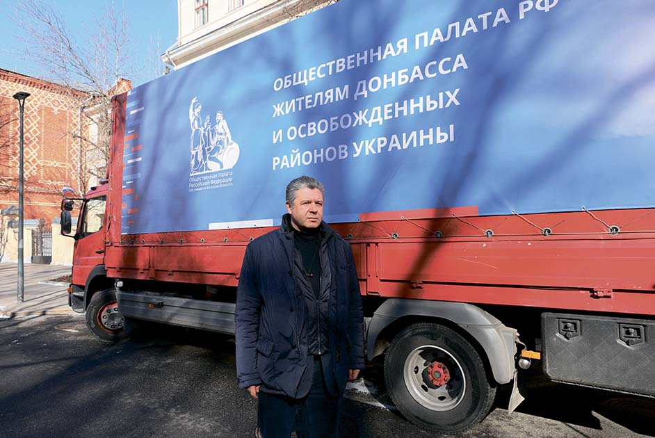 Член Общественной палаты РФ Максим Григорьев во время отправки гуманитарного груза
